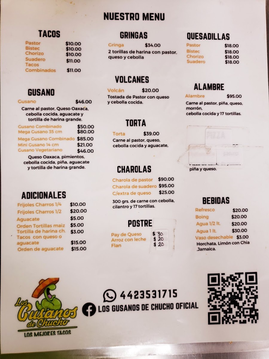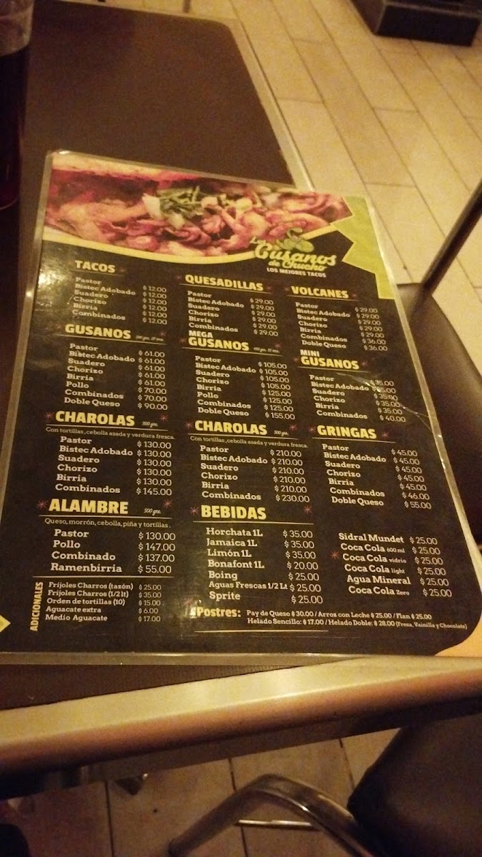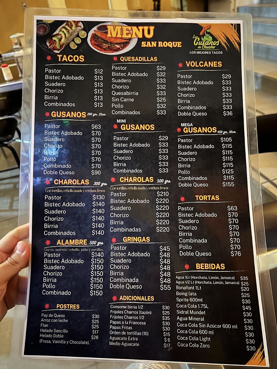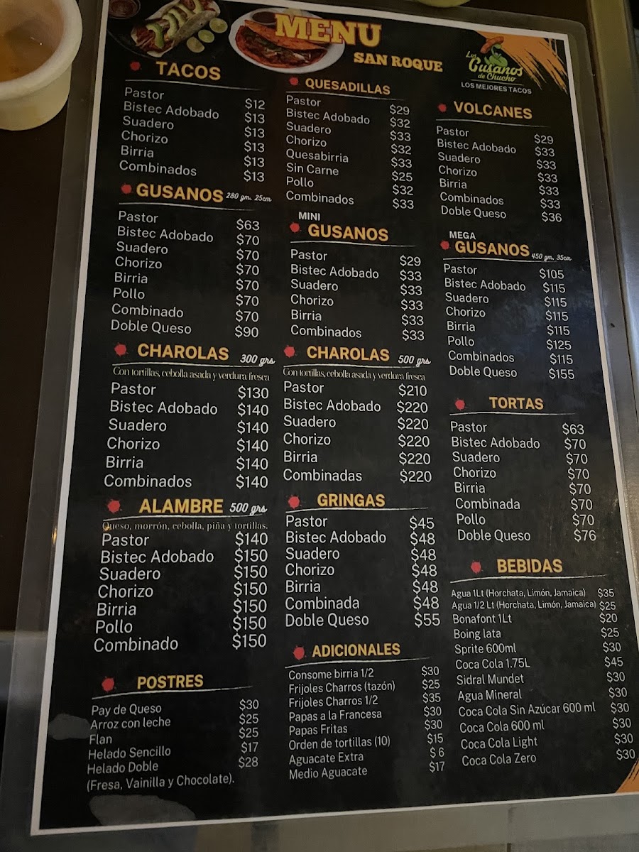 The menu at Los gusanos de Chucho Oficial offers a variety of Mexican fast food items centered around tacos and traditional dishes. Visitors can find several taco preparations including Gusano de Pastor, Carne Suadera, and Birria options such as the Mega Gusano de Birria. Quesadillas are also available with fillings like bistec and pastor, complemented by sides such as Frijoles Charros.