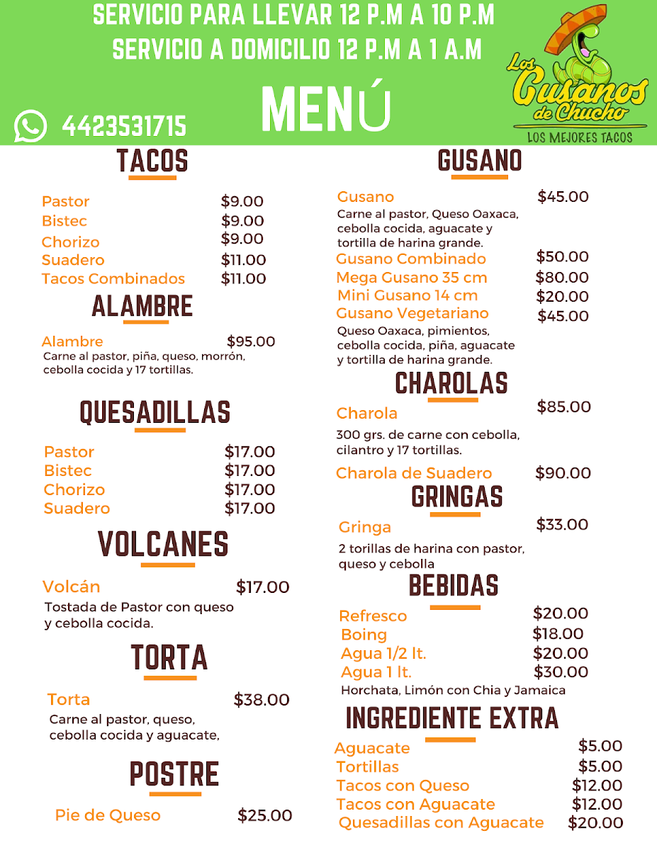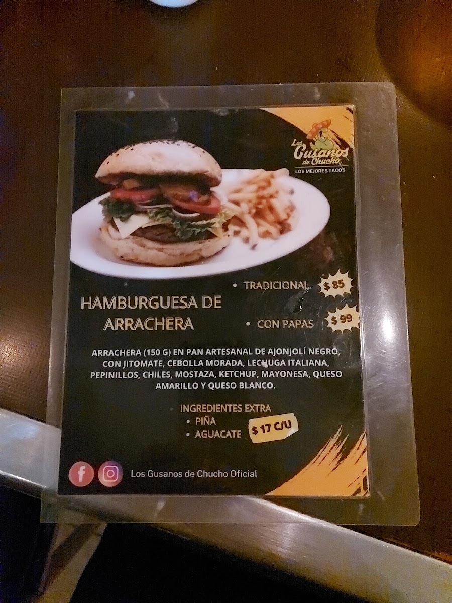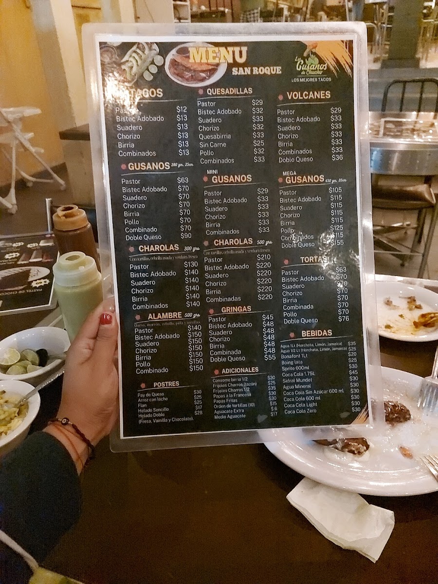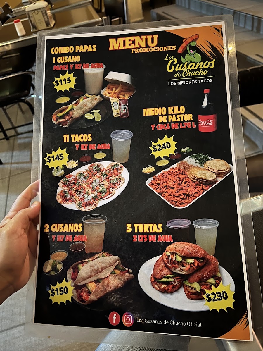 The menu at Los gusanos de Chucho Oficial offers a variety of Mexican fast food items centered around tacos and traditional dishes. Visitors can find several taco preparations including Gusano de Pastor, Carne Suadera, and Birria options such as the Mega Gusano de Birria. Quesadillas are also available with fillings like bistec and pastor, complemented by sides such as Frijoles Charros.